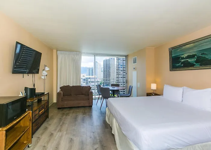 Ilikai Marina 1889 City View Studio villa has an equipped kitchen fitted with a fridge, an oven, and kitchenware. The Honolulu property is a stone's throw from restaurant Ala Moana Hotel. The nearest bus stop is Trolley, within easy reach of this 1-bathroom villa.